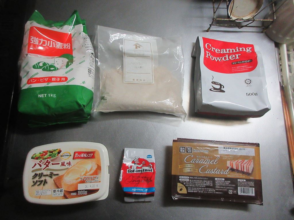 魔の五連勤が終り漸く迎えた週末休み 漸く涼しくなり過ごし易い気候 そんな休日にこれらの食材達で Let's cooking! まずは ドライイースト2.5gと砂糖5gをぬるま湯100gに入れ 予備発酵イースト作り お次はタッパに 強力粉200g、全粒粉50g、塩、クリーミーパウダー、ぬるま湯 予備発酵イーストを流し入れ カードで混ぜ混ぜ 混ぜ混ぜし粉っぽい所が無くなったら 台に移し・・・捏ね捏ね6分 バター風を加え・・・捏ね捏ね6分 表面がつるんとしたら 一次発酵開始・終了後 生地君が成長してくれたので 台に移し・・・二分割にし 濡れ布巾を掛けベンチタイム10分後 生地を成形し型に入れ 二次発酵開始・終了後 再び生地君が成長してくれたので 220℃で予熱したオーブンで200℃27分焼き焼き すると いま一歩・・・ですかね・・・ これを冷ましている間に今回は特にする事は・・・ありましぇ~~ん! パンをカットして業スーで購入した 「カラメルカスタード」をサンド まずは 麒麟淡麗生で乾杯! 週末休みの午前中早くから自宅で飲む麒麟淡麗生マジ、格別ですね♪ 出来上がったおつまみは これ 「カラメルカスタードサンド」 そのお味は うん、うん これメチャ・・・旨いんだな♪ だ・か・ら 「まる」の冷飲み始めちゃうんだな(^^; では、では