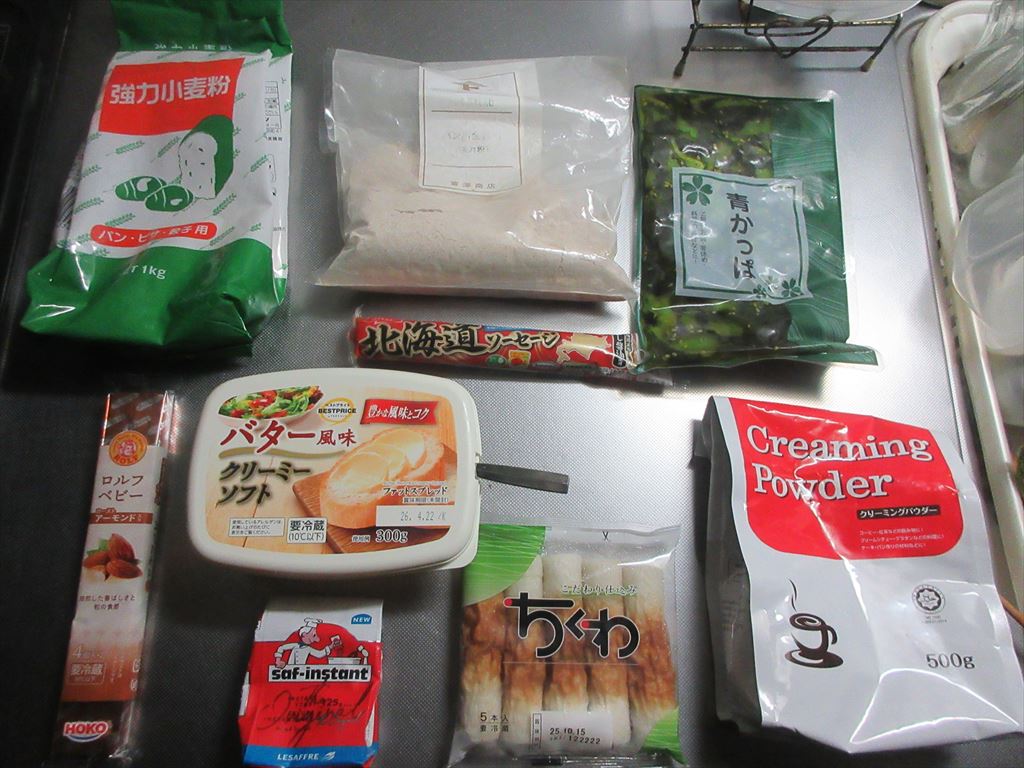 残念ながら本日、連休二日目で最終日 二日間のお休みなんてあっという間に終わっちゃいますね・・・ しかも今週は平日休みが無く魔の五連勤 やーねー(^^; ま愚痴っていても幸せはやって来ないので これらの食材達で Let's cooking! まずは ドライイースト1gと砂糖7.5gをぬるま湯58.5gに入れ 予備発酵イースト作り お次はボウルに 強力粉75g、全粒粉25g、塩、クリーミーパウダー 予備発酵イーストを流し入れ 混ぜ混ぜ 混ぜ混ぜし粉っぽい所が無くなったら バター風を加え・・・捏ね捏ね6分 表面がつるんとしたら 一次発酵開始・終了後 生地君が成長してくれたので 台に移し・・・三分割にし 濡れ布巾を掛けベンチタイム10分の間に ちくわの中に青かっぱとアーモンドチーズをイン でベンチタイム終了後 生地を成形し 二次発酵開始・終了後 生地に装飾を加え 200℃で予熱したオーブンで180℃で12分焼き焼き まずは 麒麟淡麗生で乾杯! 連休最終日の午前中早くから自宅で飲む麒麟淡麗生マジ、格別ですね♪ 出来上がったおつまみ達は これ ちくわパン(青かっぱ・アーモンドチーズ)と 魚肉ソーセージパン そのお味は うん、うん うん、うん うん、うん どれも意外と・・・旨いんだな♪ だ・か・ら 「まる」の冷飲み始めちゃうんだな(^^; では、では