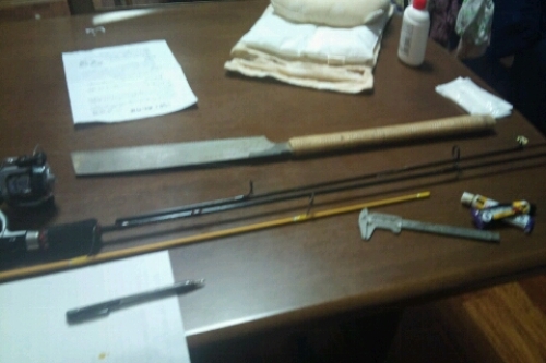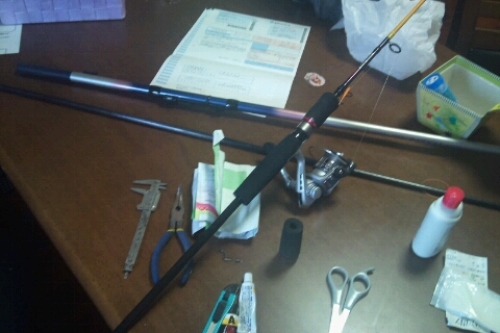 竿が折れたら 捨てられずに倉庫においてる私です。しかし今はインターネットのおかげで情報が入るからいいですね。まさか自分で竿を修理できるとは・・・・・(あくまでも自己流)というわけで 先日真っ二つになった“パックショット”を修理します。まずは道具を集めて 作業開始!なんとこの竿を買う前に穂先が破損した ウルトラライトのロッド(4分割)を捨てれずに保管してました。黄色がそれです。ノギスで折れたところの内径と外径を調べます。なんと 黄色いロッドの部品とほぼ同じ!ほとんどそのままいけそうです!なるべく接着面を増やしたいのと パックショットの問題点だった 短さも改善しようと思いなるべく長くなるように接着します。差込むとこんな感じです。ちょうどガイドのところで良いサイズ(誤差1ミリ)ここは このままでもいいですが 糸を巻いて少しあわせます。竿先側は逆差込で サイズが同じだったので少し削ります。こんな感じ。切断も 削りも すべてカッター一本です。これで十分です。差込んでみます。おおおおおおおおおお!すばらしいいいいいいいいい!ぴったんこ。あとは接着ですね。エポキシ系の接着剤でくっつけます。ここら辺も 木工関係で使うので在庫は十分です。(もちろん100均)硬化時間も10分と 短気な私むき。段差ができてるところも 硬化してから再度盛り付けを繰り返すと 綺麗になるようですね。で完成!1時間後には完全硬化してましたので 曲げテスト!合格!同じようなライトロッドだったからか曲げがちょうど良い感じです!ガイドは増えてますが 感度重視でそのまま。あとは塗装なんですけど 早く試釣したい!!!!!!釣れたら塗装かな?しかし こんなに簡単とは思いませんでした。にほんブログ村 家族ブログにほんブログ村 家庭・家族にほんブログ村 ハンドメイドブログにほんブログ村 木工にほんブログ村 車 修理・整備にほんブログ村 自作PCにほんブログ村