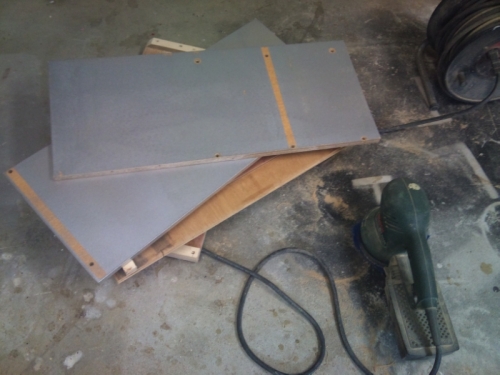最近釣りばかりしてますね・・・・でも少しづつやっていきましょう!(といいつつ大慌て)まず 前回作ったパーツにヤスリをかけます。40番でゴリゴリと。ざっと削りました。そしたら早速組み立てます。ここまできたら簡単です。がんがんと インパクトで締め上げて完了!でも棚板と 天板は板をはいでいるわけではないので材料ごとに波打ってる状態ですが・・・・・そこに 引き出し用の縦板を取り付けます。こんな感じで。引き出しが幅 15.8で3つ入りますので仕切りは2個入れて 上下固定。すると 端材は一体化しました。これでまた40番でゴリゴリやります。これでよし。これに背板をあてて固定していきます。この状態で 昼飯を食べて 乾燥させました。そしてトリマーで習い加工して切り出します。ほぼ完成です!はやいとこ設置したいので 続けて塗装。ライトオークで塗装しました。この上から仕上げに ウオルナットを塗るとむらなく塗れます。早く仕上げたいよう!にほんブログ村 家族ブログにほんブログ村 家庭・家族にほんブログ村 ハンドメイドブログにほんブログ村 木工にほんブログ村 車 修理・整備にほんブログ村 自作PCにほんブログ村