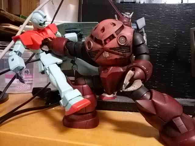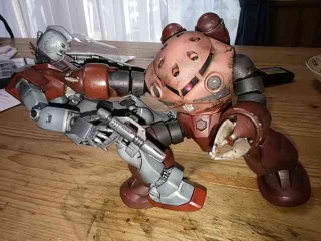 さてウェザリングカラーで汚しも終わりました。上からクリアでコートしたんでズゴックと組んでみました。いい!すごくいいです!すげーなー自分が作ったなんて信じられない(^_^;)あいかわらずズゴックは安定してますね。片手でジムを載せて ポーズを取っても倒れたりしません。すごいバランスです。今後 ビネットにしたらアルミ線で支える予定ですが必要はあまりないかもです(*^_^*)さあジムはカメラ部分を取り付ければ完成。やっとベース作りに行けそうです(*^_^*)にほんブログ村 家族ブログにほんブログ村 家庭・家族にほんブログ村 ハンドメイドブログにほんブログ村 木工にほんブログ村 車 修理・整備にほんブログ村 自作PCにほんブログ村