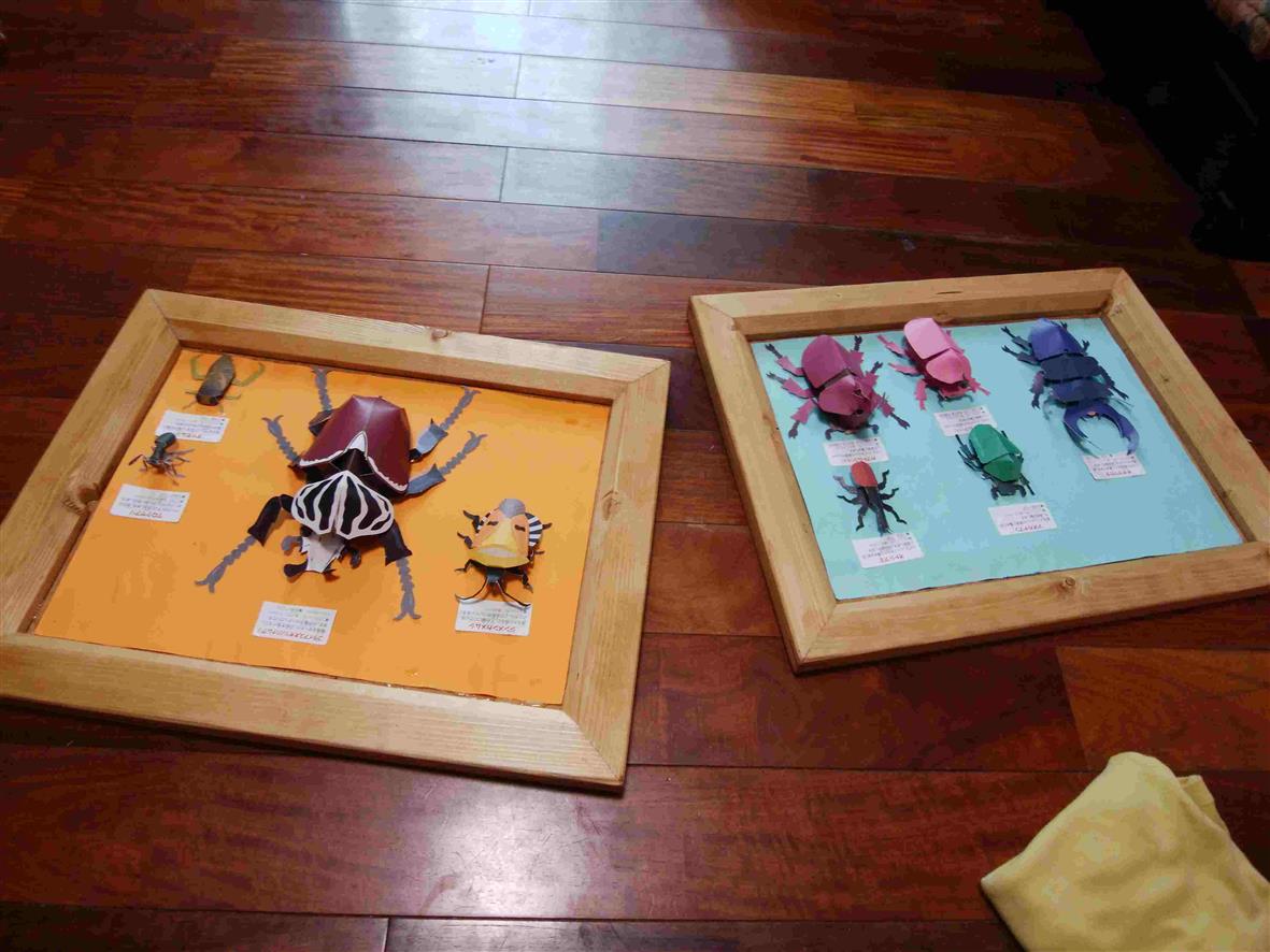 ペーパークラフトの虫を画用紙に貼って