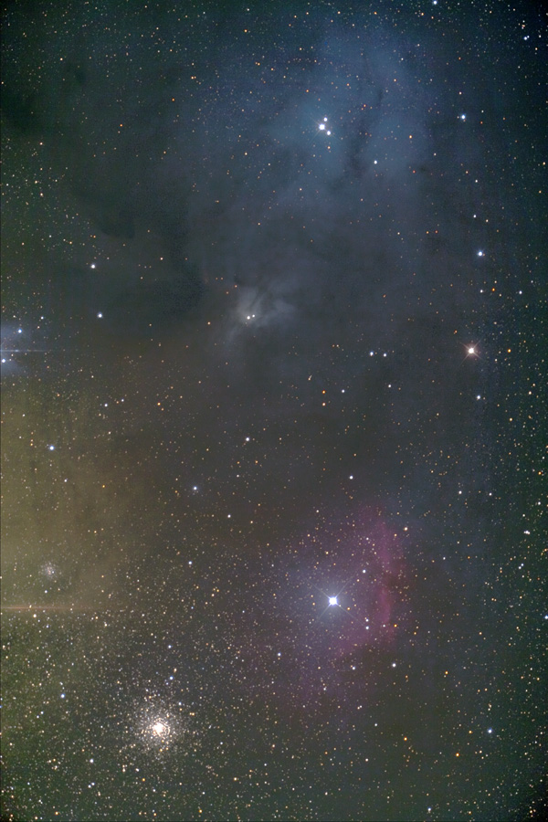 6月1日の早朝に撮ったものの処理が終わった分です。みなみのかんむり座の球状星団NGC6723とその周辺の散光星雲、暗黒星雲です。この日は、低空は透明度が悪く、未処理のRAW画像は緑被りが激しく、暗黒星雲がよく写るか心配で、8分の露出を8コマ撮影しました。(私は天頂付近の天体であれば普段は6コマで撮影しています。)今回撮影した付近は、望遠鏡で眺めても球状星団と散光星雲がもやのように見えて面白いところですが、低空のため、たまにしかよく見えません。【撮影データ】ε-180ED+Canon EOS Kiss Digital改造 2008/06/01 0:42 ISO感度800EM200Temma2Jr ATK-16IC FL80S MaxImDLにてガイド