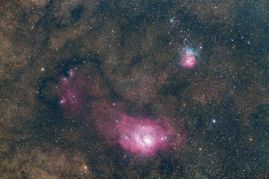 4月29日の朝4時からの露出、8分を2枚撮ったところで、3枚目は撮った画像を見ると青くカブってしまっていました。4時半には次第に周りも明るくなったので、機材を撤収しました。干潟星雲の撮影にかかった頃はもう既に南中を過ぎていましたが、この機会を逃すと梅雨に入って、この先また撮影できるのがいつになるか分からないので、とりあえず撮れる枚数だけ撮ろうとして撮影したものです。結果は2枚ともガイド、ピントもそこそこで2枚コンポジットしました。右側に少し薄明時の青い色が出ていますが、あまり目立たないので、そのままにしてあります。【撮影データ】ε-180ED+カメラ機種名 Canon EOS 5D Mark 22009/04/29 3:59:55ISO感度 400 8分×2コマコンポジット画像サイズ 3861x2574を900×600にリサイズ画質(圧縮率) sRAW1→tiff→jpeg赤道儀 EM200Temma2Jr ガイド Atik16-IC+FL80S+MaxImDL