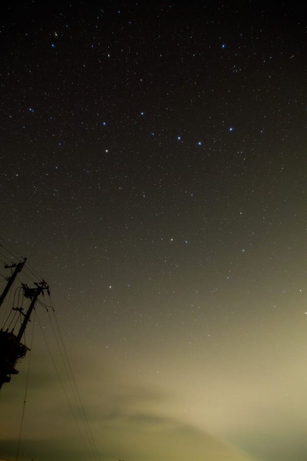 4月26日に強風の中、望遠鏡ではガイドエラーが出ると思い、カメラレンズで撮った星景写真です。EOS-5D Mark2+シグマ20mmF1.8→F4 ISO800 2分1コマ ケンコーフィルター有りです。ノートリミングです。北斗七星から北極星を探すときの説明のような写真になりましたが、北東からの光害がこんなにひどいとは思っていませんでした。丁度北に低く雲があったので、光害が増幅された格好になりました。撮影時刻が22時頃だったので、まだ大分市からの町の光も衰えを見せていないようでした。