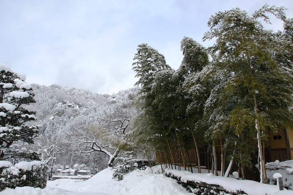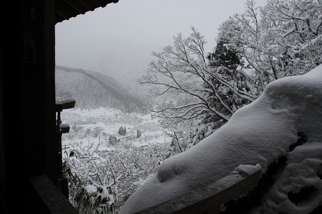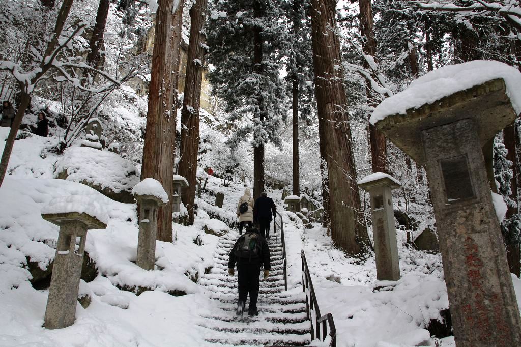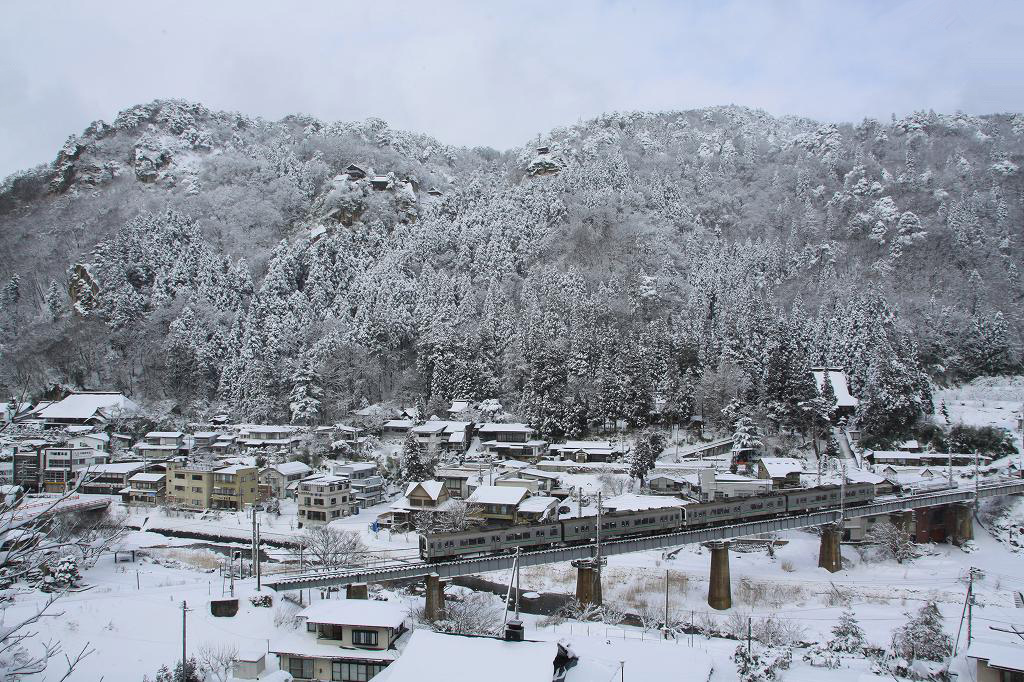 行くべきか?それとも登るのは明日にするべきか?・・・・甘味処で降る雪を眺めながらコーヒーなんぞを頂いてた。また電車でも撮ろうと電車時間を尋ねたら、雪の為、20分ほどの遅れが出ている電車がもうすぐ来るはずだよ、と、お店の綺麗なお嬢さんが教えてくれた。それならばと、重い腰を上げ、鉄橋の撮影ポイントに向かった。♪ Man ♪ 結局、電車から降りてきた観光客に引きずられるようにオイラも小降りになってきた立石寺へ向かったのだった。(笑)