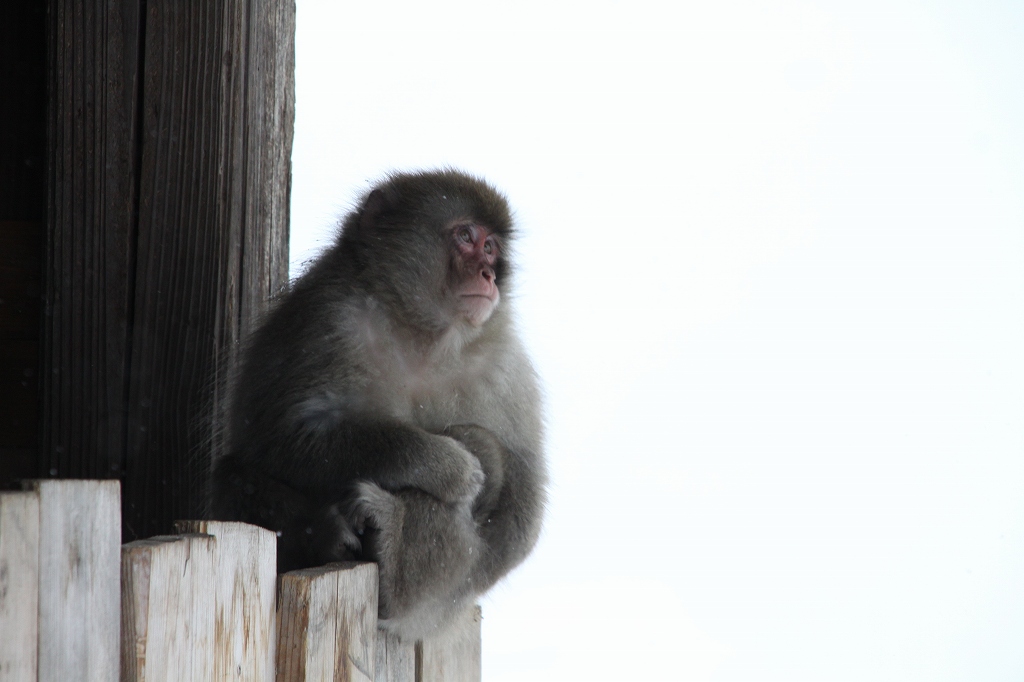 五大堂からいよいよ、恐怖の復路へ・・・・すぐ下に建つ百丈岩上の開山堂越しの町を・・・と思いながらカメラを向けた。ん???そこには何か動くものが・・・・♪ 時の過ぎゆくままに ♪ まさかとは思ったが、そこにはお猿さんのカップルが居て、オイラを観てた。付近には餌さ箱とか無かったからたぶん野生だと思うけど、思いもかけない驚くような出会いだった。