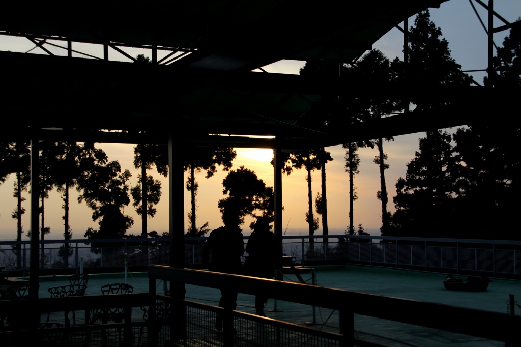 楽しい時間は早く過ぎて行くものであっと云う間に陽は暮れてしまう。山頂から夕陽を撮ろうと想ったけど太陽が雲でぼやけてきたので下山することにした。大鳥居まで下りて来たら西の空が赤みを増し少し夕陽らしい輪郭になって来た。若者達や外人さんたちも車やバイクを停めみんなでその美しさが増すよう期待しながら見入っていた。これが還暦の歳に謎の未来都市と謎の山で過ごした美女との不思議な秋の日の出来事である。全てフィクションじゃ無いよね、あるこ姫(笑)