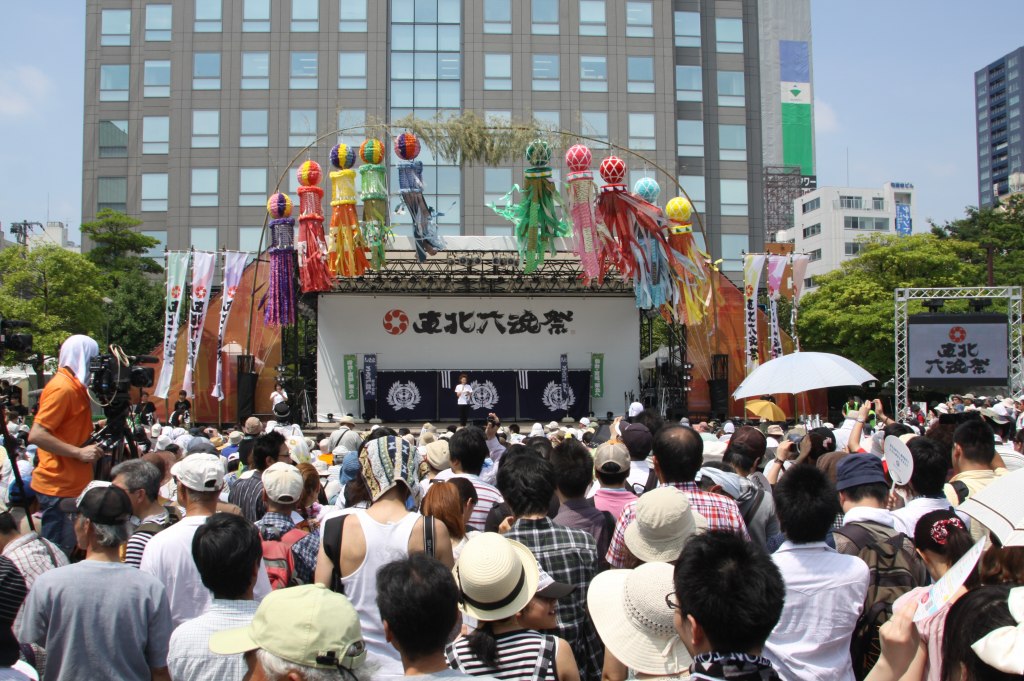 「東北六魂祭」は、東北の誇り高き魂をもう一度奮い立たせ、まだまだ続くこの試練の時を乗り越えるために。東北の6つの祭りの魂がひとつになることで、災厄を吹き飛ばす。そんな願いを込めて命名された祭りです。と、趣旨が標示されてました。上2枚が祭り当日に撮ったもの、暑くて、熱くて、厚くて(人垣が)、オイラはもう30分で滝汗の為退散と相成り候。でも、なぜか美女は汗かいてなさそうだった。以下の写真は準備中の会場で前日に撮ったものです。