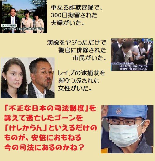 森法務大臣がゴーンの記者会見を受け、夜中に緊急記者会見を行なった。取り繕いに必死なんだね、わが国の司法は正当・・云々と。山口敬之はどうなんだ。どうして裁判所が出した逮捕状が寸前に執行停止になったのか、そも理由を説明してもらいたいもんだ。森法相は大変重大な発言をしている。「日本では捜査機関から独立した裁判官による審査を経て令状を得なければ捜査機関が逮捕することはできない」。思い出そう。これほど厳正な手続きを経て出された山口敬之の逮捕令状の執行を中村格は取り止めさせたのだ。まことに異常ではないか。