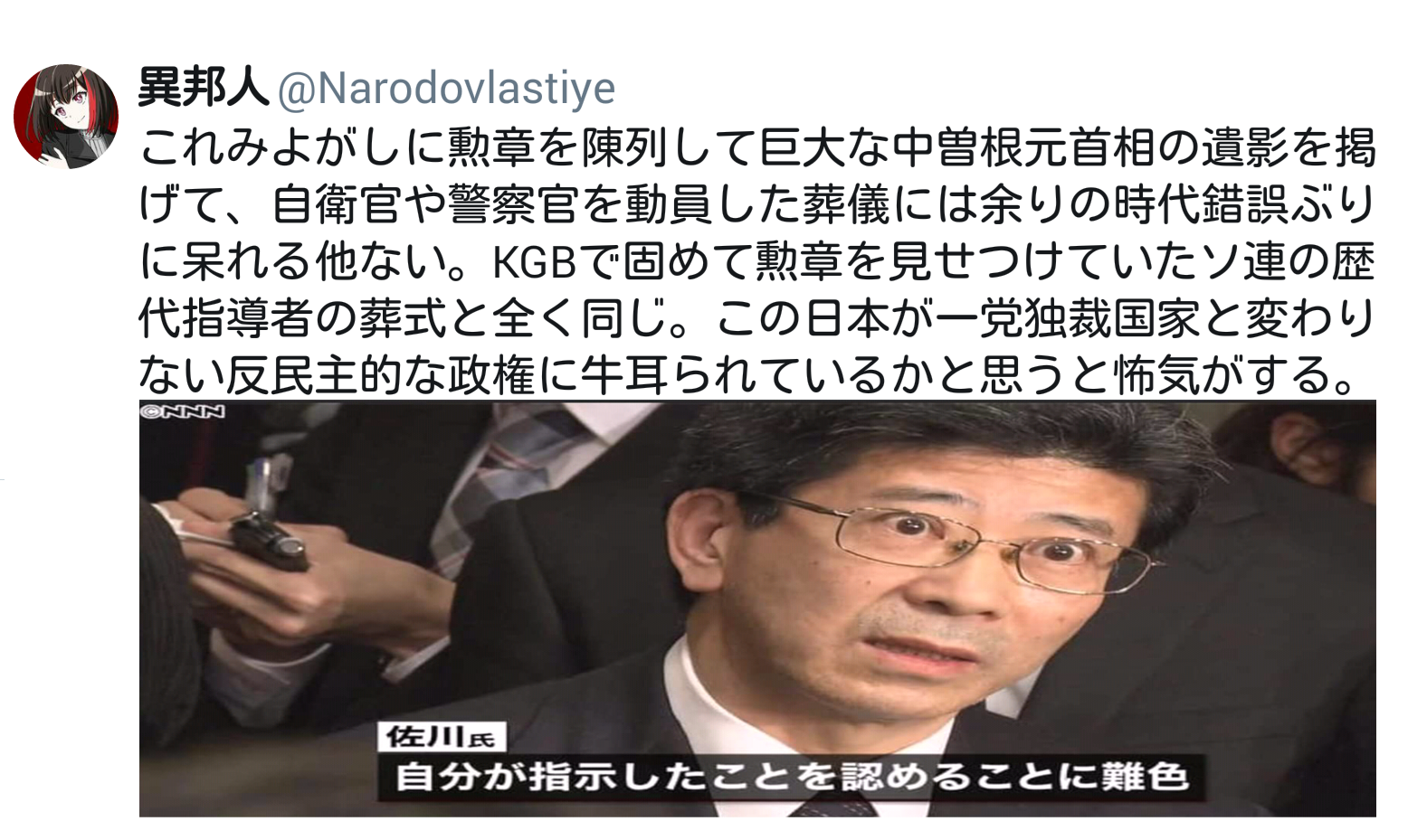 自民党が政党助成金以外のお金で中曽根康弘氏の葬儀を行うことに誰も反対しないが、国民の税金を9600万円も使い、さらに「内閣」が国立大学に弔意表明を求めるのはおかしいだろ。無茶苦茶だ。自民党がこの国は自分達だけのものと勘違いし、傲慢になっている証拠だ。