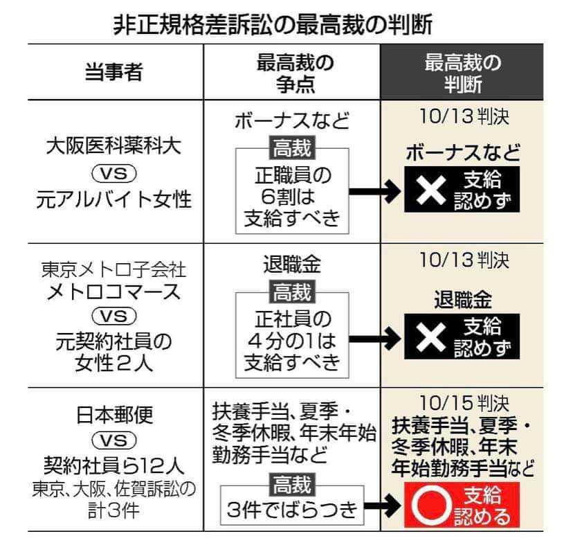 女性は東京メトロ子会社の駅売店で契約社員として働き、退職金が支給されないのは労働契約法20条が禁止する「不合理な格差だ」と訴えていた。第3小法廷は、正社員は地域マネジャーも担うなど業務内容に違いがあることを重視し、請求を退けた。ボーナス不支給が争われ、同日判決が言い渡された大阪医科薬科大の元アルバイトが起こした訴訟でも、同小法廷は業務内容の違いを指摘し、支給を認めなかった。この国、いったいどこまで衰退するんかな。