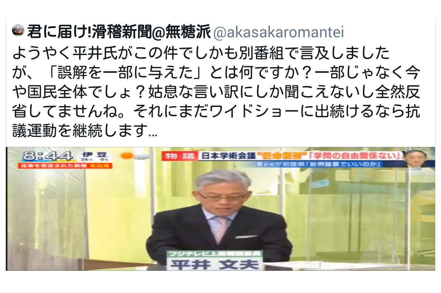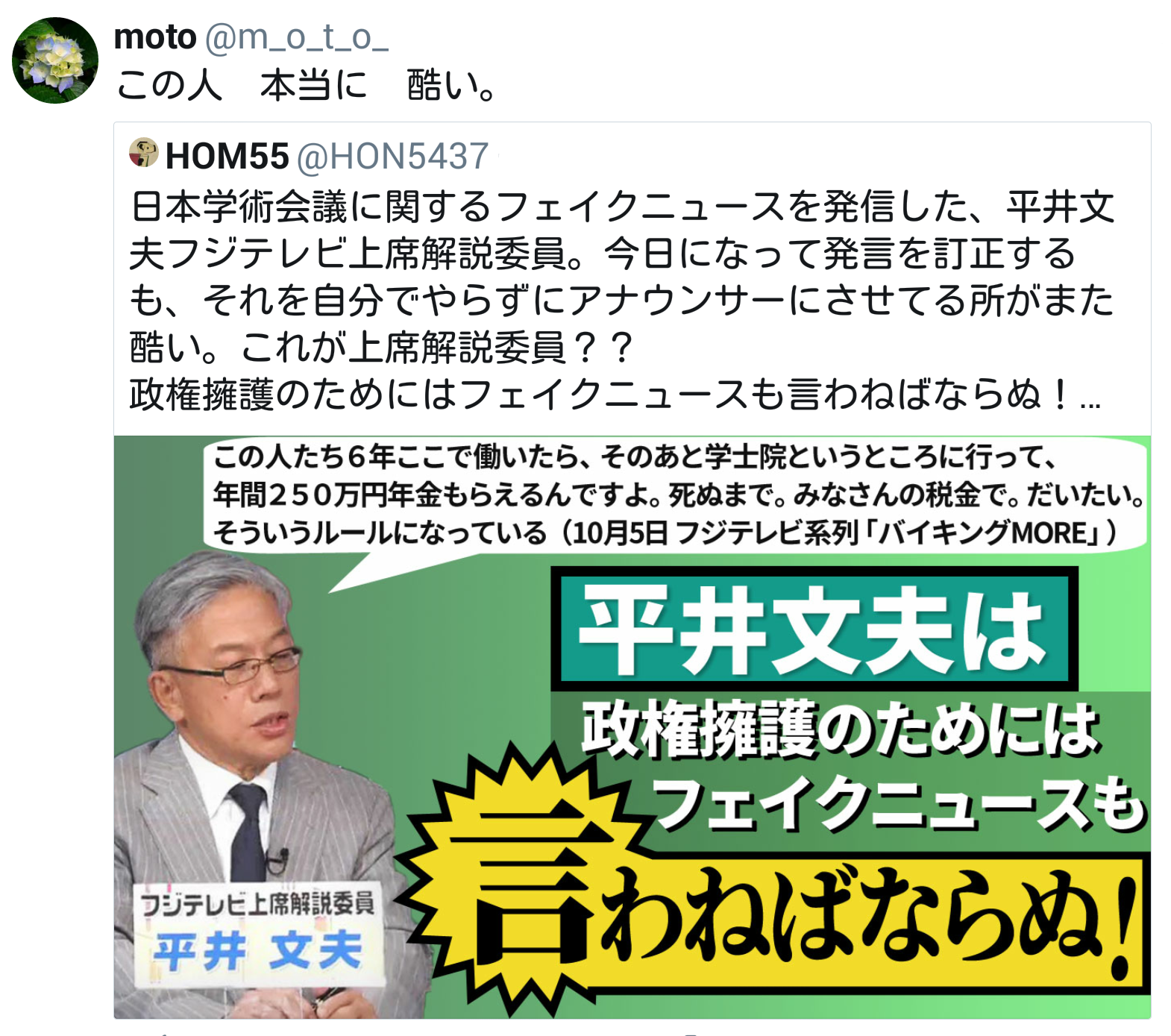 「昔の政治家は汚職で逮捕されると辞職したものだ」とたまに聞くが、「昔のジャーナリストは事実をねつ造したら職を追われたものだが」とフジテレビ上席解説員を見て思う。