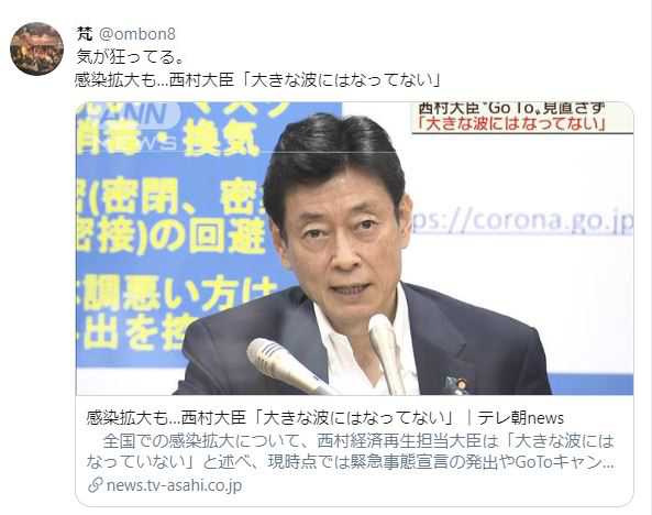 西村は経済という名がついてる大臣のくせに、経済を知らなすぎる。労働者が皆月給制のサラリ-マンじゃあないんだよ。個人企業は、企業全体の半数を超える52.7%を占め、従業者数は634万人と、企業全体の11.9%(総務省)そんな気楽に休めるか。