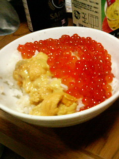 本日の夕飯は、北海道土産でした。いくらのしょうゆ漬けと塩水うにを使ったうにいくら丼。いくらおいしいです。うに、最高です。普通に売っている板にのったうには形が崩れないようにミョウバンに漬けています。だから少し苦い味がします。しかし、この塩水うには違います。生のうにを塩水に漬けてそのまま密封しています。だから甘いんです。すごい甘いんです。幸せでした。今回は少ししか買わなかったので、電話でまた注文します。