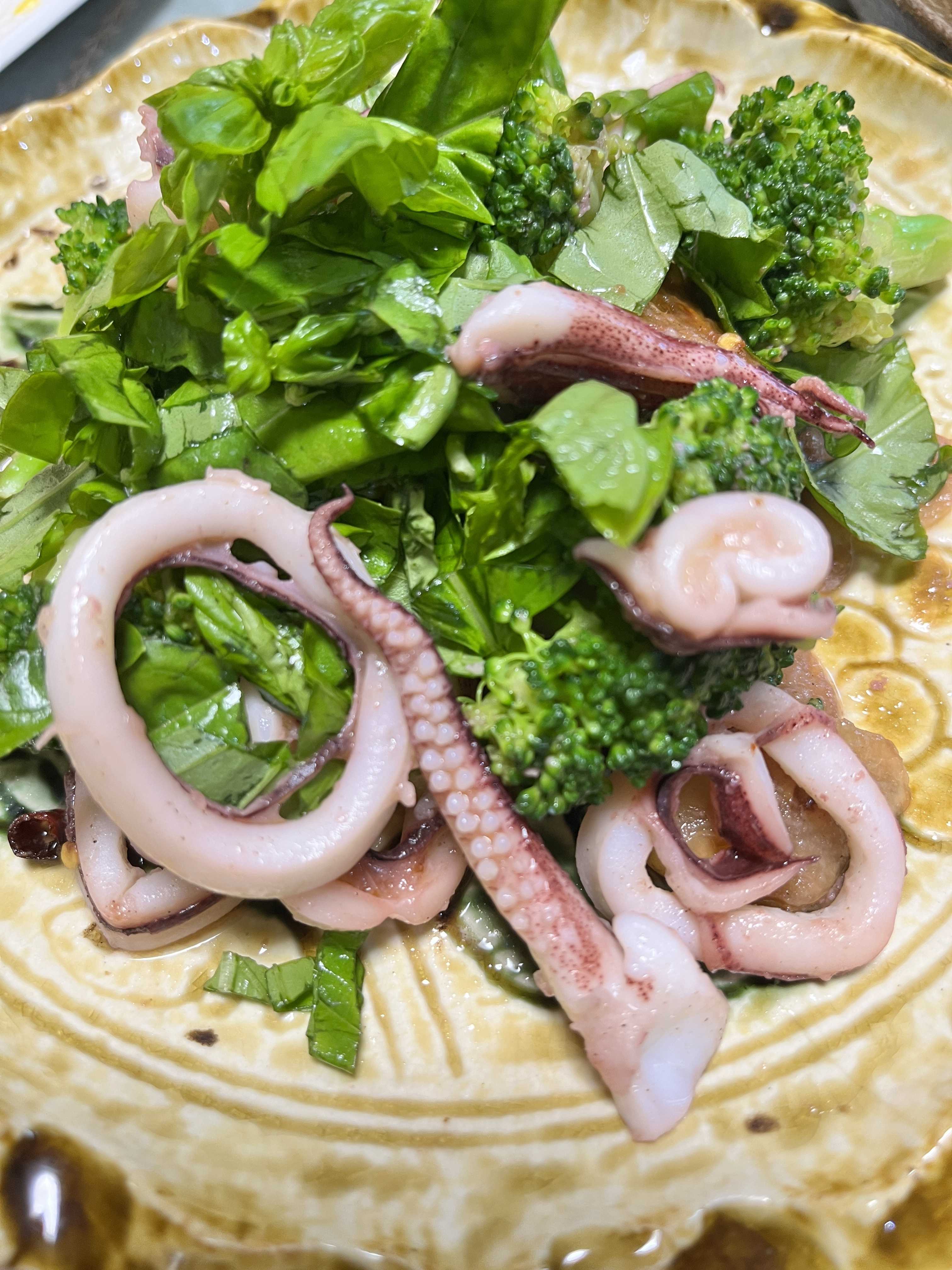 剣先イカとブロッコリーのガーリック炒めバジルたっぷりのせて