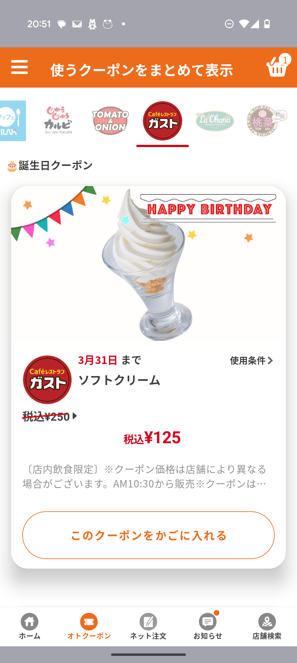 誕生日特典🎂で、すかいらーくアプリにて、ガスト ソフト🍦クリーム半額クーポンがありました。半額で、美味しくいただきました😊⚠️注意⚠️ 店のタイミングによって、ソフト🍦クリームが品切れになっている場合があります。 そのため、クーポン番号を入力する前に、メニュー表からソフトクリーム定価の商品番号を試しに入力して、在庫確認をしてください。 在庫切れなのに、誤って一度、アプリに配信されたクーポン番号を使ってしまうと、二度と誕生日🎂特典の半額クーポン番号が出てこないんです!! ガストは、店内飲食だけでなく、持ち帰り🥡メニューも充実していますね〜!!\クーポン利用で50%OFF!お買い物マラソン限定/冷凍食品 惣菜 ハンバーグ から揚げ/ガスト×ジョナサン 洋食コラボセット5種8袋(すかいらーく洋食スペシャルセット)/冷凍ハンバーグ デミグラスソース ピラフ ポテト ピザ 洋食 洋風惣菜 お惣菜 おかず 弁当価格:8,990円(税込、送料別) (2025/3/23時点)