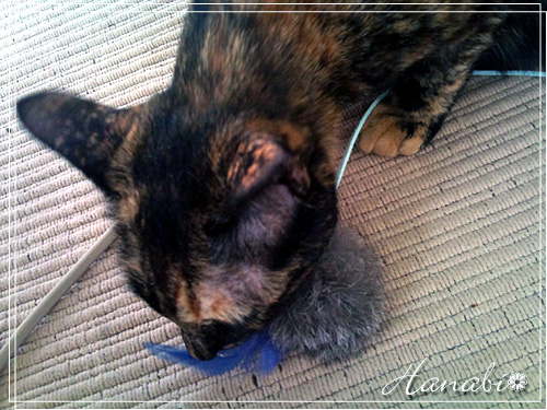 ***新しいおもちゃ☆***こんにちは~♪いや~あったかいデス♪ そうなると、あーたんがお布団に入ってくれなくなってきた。。。 暖かいのは嬉しいけどちょっとさみしい季節の始まりですね☆ ▽お気に入りのおもちゃを先日食べた…あーたん。。。 今日から新しいおもちゃをど~ぞ~!***▽早速、あーたんのお気に入りのソファーの上のゴミ溜めに持ち込んだので、 取り返そうとすると、、、、 ▽うきゃ~~~~~~!▽むき~~~~っ! ▽突然「キチンッ!」? ▽まだ取り返そうとすると、、、、 むひゃっ~~~~~~!▽あーたんオチリが丸見え~♪はずかち~っカワイイ~~~~っ▽足が引っかかったんにゃ~! (般若のような顔で怒る…) ▽ふぅっ。 おもちゃはまた食べないように隠しました…☆あーたんは昨日からチッチが一日3回になってきました。 ストラバイトが直ってきてるかな!? 尿検査をしてもらお=っと♪ ▽参加してみました♪よかったらぽちっとお願いします▽