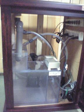 今日はスキマー(東熱スパイラルプロテインスキマー外部式)を設置しました。大きさ的にキャビネット内に収まらないので、キャビネット後方のスペースに置くことにしました。スキマーとスキマー用のポンプ(オーシャンランナー3500)をホースで繋ぐのですが、ポンプは市販のホースでも使用可能なのでホームセンターに行って内径15・外径20の耐圧ホースを買ってきて取り付けました。新品のスキマーはとても綺麗なのですが、そのうち う○こ まみれになってしまうのでなんだかとても切ないです(T-T)でも う○こ まみれになる位働いてもらわなければなりません。頑張れスキマ~!と願いつつ今日の作業はここで終了です。明日はクーラーを接続して、いよいよ真水で試運転と行きたい所です。