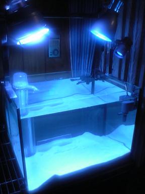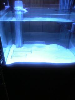 今日は仕事がお休みだったので、午後から灰汁抜きした真水を抜き海水に変える作業をしました。まぁその前に底砂を敷く作業をするのですが、僕の場合は60cmの水槽という事で底砂を約25キロちょっと入れました。底砂の厚みは平均6センチ前後を目安に。使用底砂 ・フィリピン産サンゴ砂パウダー 約18キロ ・バイオアクティブアラゴナイト(バクテリア付き) 9キロ初めはノーマルなサンゴ砂だけ買ってあったので、それで行こうと思ったのですがアラゴナイト含有の砂が良い事を途中で知り、でも全てアラゴナイトに全てするにはもったいないと思い後でアラゴナイトを追加しました。まずはパウダーのサンゴ砂を3.4回を目途に洗って、海水を少し張った水槽に入れました。その上からアラゴナイトの方はとりあえずバクテリア付きなので洗う必要はなく、そのままドボンと入れました。一応ライブサンドなので水合わせとかした方が良かったのかな?とか思いつつ・・ 底砂が敷けたので次は海水作りを始めました。総水量がどれくらいになるか正確に知りたかったので30リットルのRO水を衣装ケースに貯めて、それをヒーターで温め塩入れて海水を作ってサンプの中に入れていきました。ROを10リットル貯めるのに約40分、合計120リットルの海水が入った時にはもう夜中を過ぎてました(T-T)正確にはあとライブロックが入ると水量はもう少し下がりそうですけど。さすがにまだ水は濁っているのでこれで少し回して様子を見ようと思いました。PS:ライブロック早くこないかな~