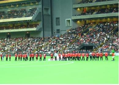 選手はひとりずつ紹介されて、観客席の間からもみくちゃになりながら降りてくる。