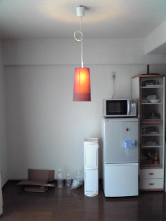 土曜は家具を、今日は照明や小物を買いにいきました。 楽しいけれど、なかなか大変です。 人混みだし、迷うし、お金使うし。 家具を買えたのは嬉しいのですが届くのは来週以降に 少しずつです。 一辺に届かないのがもどかしい~。でも、理想のお部屋作りができそう♪で、照明だけは持って買えることができたので よいしょよいしょと持って帰ってきました。 し~か~し 照明だけ付けたら、そのあまりの滑稽な姿に 私は5分以上笑い続けちゃった! 伝わりにくいかもしれないけれど、本当はこの照明の下に、ダイニングテーブルがあるはずなのです。それがなくて、ただ、ぶら~んと宙にういてる照明はなんていうか、愛嬌があるというかこんな照明のコミカルな姿はもう一生見られないと思うので カメラに納めました♪ごらんあれ☆