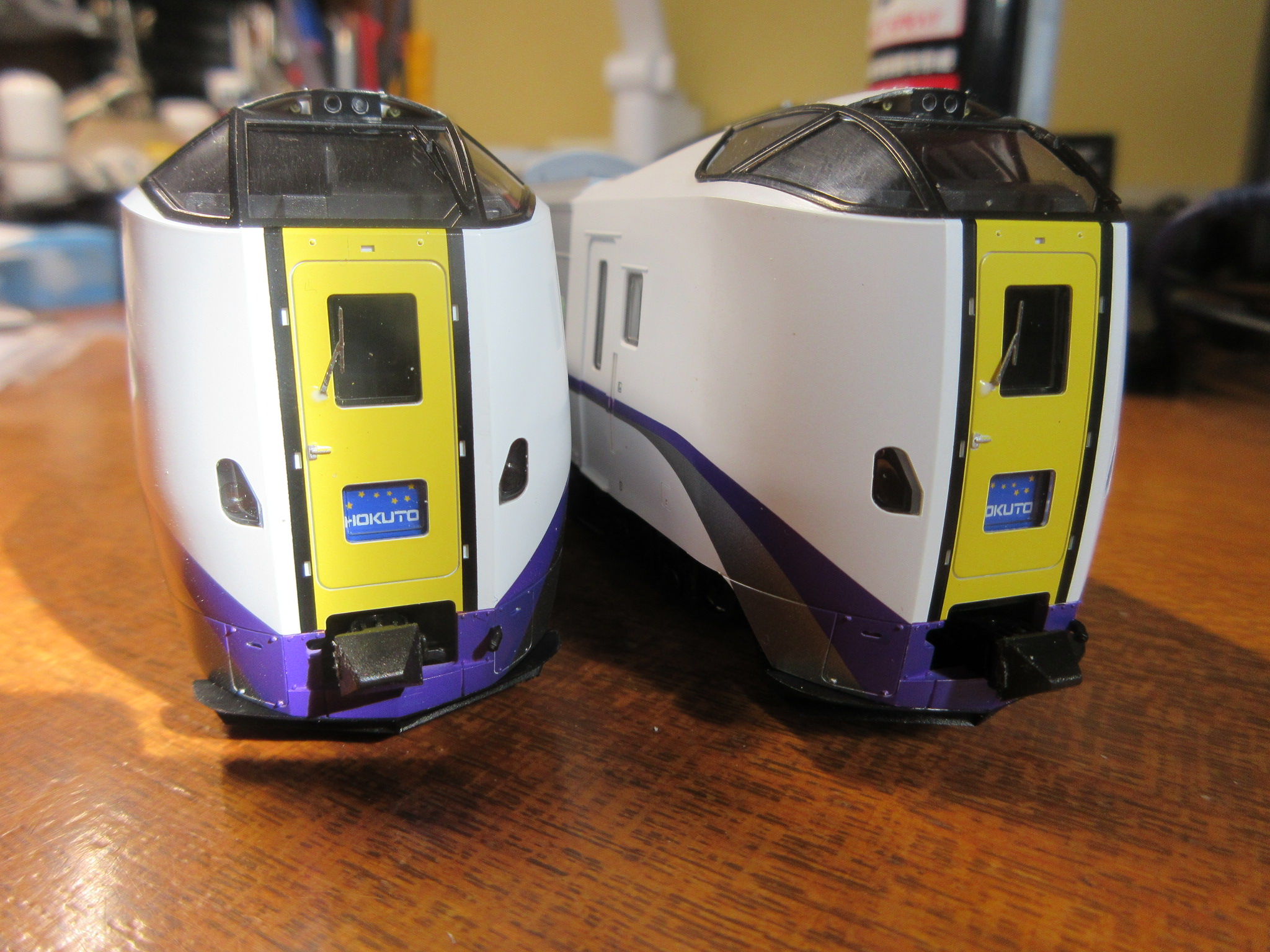 お蔭さまで閲覧数が150,000件を超え、お気に入りに登録いただいているフォローアーの方も6,400名強いらっしゃいます。ともかく、内容の深さ、正確性を旨として投稿に努めますので、よろしくお願いいたします。北海道の雄大さが好きで、最近7年間で9回訪れましたが、フェリーとマイカーだけでなく、鉄道にも乗って多面的に自然と大地を満喫しています。キハ261は室蘭から函館まで特急「北斗」に乗り、狩勝高原の新得で特急「十勝」に乗りました。北海道は廃線跡巡りや釧路湿原ノロッコ列車、富良野のノロッコトレイン、釧網線の原生花園にも乗り、鉄道の存在感が大きいです。とりわけキハ261は下降気味のJR北海道に新風を招く爽やかな印象で、TOMIXの新製品発表があって、すぐに昨年予約しました。付属のワイパーを取り付けて、早速雄姿を手許で再現。ニヤニヤ。札幌から函館本線、室蘭本線、千歳線経由で函館駅に到着した特急「北斗」です。北海道は2両連結が多い😢ので、7両編成だけでも威風堂々としています。狩勝高原の新得駅を帯広から札幌に向けて出発する函館本線の特急「十勝」です。ホームの向こうに広がる草原にはかつて新得機関区があり、難所の狩勝高原越えのD51が扇状機関庫や給炭塔周辺にウジャウジャいました。新得駅は根室本線の要所でもありましたが、2016年の台風災害で新得、富良野間がバスに置き換えられたまま復旧せず、結局2024年3月で廃止、根室本線は分断されてしまい、新得駅からは根室方面にしか行けなくなりました😢。何か北海道を象徴する駅みたいで寂しいですね。だから、キハ261が余計、印象的です。昭和41年(1966年)に新狩勝トンネルの開通に伴い、根室本線の新線に付け替えられ、廃線となった狩勝線の横にD51が静態保存されています。のちにリアルライン製のNゲージ鉄道模型で再現された実機です。静態保存機はスノーブロウが取り外され、ランボードやデフレクターに白線、ロッドに赤線が入るなど装飾が施されていますが、リアルライン製のNゲージ模型は新得機関区での活躍当時を1/160で再現しています。さて、北斗の模型に戻って、今回のTOMIX新製品は発売日の2/28に「れーるぎゃらりーろっこう」に予約品を取りに行きました。こういう体験は今回初めてです。基本セット4両に増結3両と室内照明6本セット3箱も含めて現金払で20%引ながら、総額112,024円の買い物です。基本セットの4両に増結用中間3両(M車含む)の7両編成の実車通りの構成です。金型の精密性がますます向上し、塗装も落ち着いた色調で見事な仕上がりです。車両の出し入れがカンタンにできるよう、いつものIMON 1/80用金箱8両ケースに収納します。この時に連結順の番号シールを車両と元箱に貼って混同しないようにしています。なお、IMON 1/87用銀箱には車長が長いので収納できません。特急車両はいつの時代も華やかで夢があります。乗車経験のある思い出深い列車を主体に集めています。早速、室内照明を取り付けます。車体の分解は取説では車体の真ん中を押し広げるように解説されていますが、実は少し端から外してバナナの皮をむくように広げていくのが楽です。今回、連結面の組付けがしっかりしていて分解しにくいので、外れにくい時は爪楊枝を間に挟んで、どの部分が引っ掛かっているかを確認しながら慎重に外しましょう。TOMIXサンライズエクスプレスでもスカートが回り込んでいて車体を外しにくいので爪楊枝が大活躍。車体と床板を外しました。車体の屋根板は写真のように親指で押さえていくとカンタンに外せます。TOMIXも随分製品の改良を重ねているようで、昔の製品は屋根板が中々外れず、マイナスドライバーで爪をひとつひとつ広げていく必要がありました。室内照明は一気に7両分を開封して、LEDチップの鉢巻きを施します。内職のおばさん気分です。車体をはめこむ時に連結面の角が非常に入りにくいですが、爪楊枝で広げて強く押し込みます。必ず四角が全部完全にはまっていることを確認してください。不完全なままで照明板を入れる次の工程に進むと、端子が外れてやり直すことになります。車体が完全に床板にはまっていることを確認したうえで、リン青銅接点がしっかり当たるよう、押し広げるように照明板を車体天井穴に挿入します。左右反対方向に挿入しますが、先頭車のキロ261とキハ261だけは運転席と逆の連結面方向に並べて挿入しますので、注意してください。LED照明は先頭のキロ261のグリーン車のみ電球色#0794で、他の6両は白色#0795です。先頭車の2枚のうち、連結面側の1枚は先端から34.5mmで切断します。写真のように寸法を測って切断するのもいいですが、車体に開いている穴の長さに合わせて切断するほうが間違いがなく、きっちり収まります。私は挿入した照明板がリン青銅の弾力で外れないよう、念のためセロテープで両端を留めています。M車は床板面が高いので特に外れやすいです。屋根板を取り付ける前に照明テストをします。数々の失