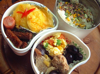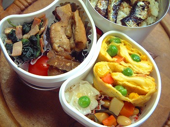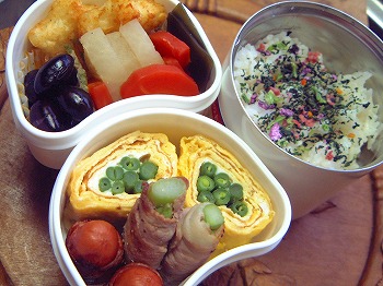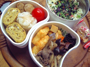 休み明け、目覚ましをセットし忘れ、いつもより1時間寝坊のIちゃんです。で、「お母さん、お弁当つくって~」牛肉のねぎ巻き 人参とイタパセ入りの玉子焼き ごぼうの煮物 常備菜 牛肉、糸こんにゃく入り、唐辛子でピリッと味付けキャンディーちくわ 三色ピーマン入りゆっこさんのメニューをいただきました。ウィンナーのベーコン巻 昆布巻き ししゃも入り。昨夜、ことこと煮ておいたもの・・・ご飯五色の花むすびを振りかけて・・・大学生のNちゃんは試験が終わったと思ったら、もう春休みなんですって・・。大学って授業料高いのに休みが多いわネェ。土曜日も休みだしね。しっかり勉強して欲しいものだわ。それにしても大阪の大学にいっている長男はいつから春休みなんだろう・・・・?3月ごろに帰るって連絡はあったけれど・・・・バイトで正月も帰ってこなかった。この子こそ、しっかり勉強してもらわなくっちゃ。今年は4回生、就職のこともあってとっても心配。しかし、親の心配をよそに本人はずいぶんのんびりのようです。本人は考えているらしいのですけどね・・・・どうなるんだろう・・・・☆☆ フォトアルバム ☆☆お弁当画像HomeのフォトアルバムにUPしていますので、よかったらみていって下さいね。☆☆☆☆☆☆☆☆お弁当の本 おすすめメニュー