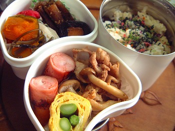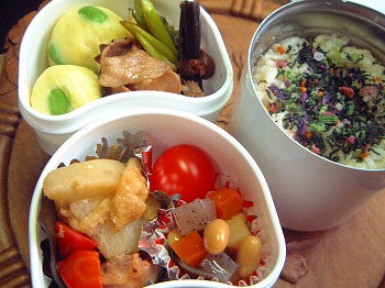 今朝はジョギングをしなかったのでIちゃんがお弁当を作りました。レンコン団子と野菜の煮物 夕残 しいたけ、白菜ゆで卵とミックスベジタブルのマヨネーズサラダ Iちゃん作 黒豆 常備菜 おせち用に作ったものです。今日でなくなりました。チーズ焼 Iちゃん作 ポテト、ゆで卵、ウィンナー、パプリカ入り酢ごぼう 常備菜 ゆっこさんに教えてもらった酢ごぼう今日で売り切れです。とってもおいしかったからまた作らなくっちゃ・・ウインナー ご飯八彩まぜまぜをふりかけて・・きょう、一日遅れでぜんざいを作りました。朝からジャラジャラと小豆を選っていたら、主人に「小豆洗い」(妖怪大戦争でナイナイの岡村が演じていた妖怪)みたいだと言われてしまいました。私は妖怪か!!☆☆ フォトアルバム ☆☆お弁当画像HomeのフォトアルバムにUPしていますので、よかったらみていって下さいね。☆☆☆☆☆☆☆☆お弁当の本 おすすめメニュー