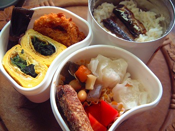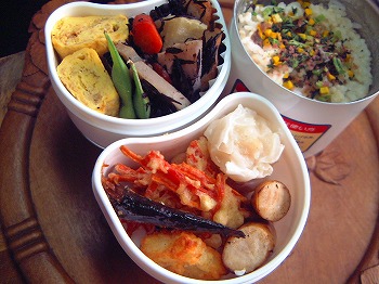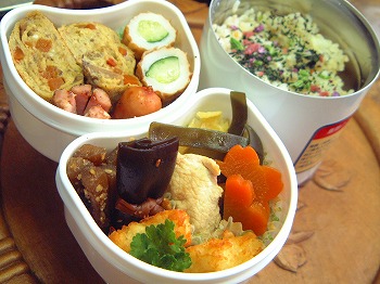 今日のお弁当は、人参づくしかな。人参のかき揚げ 自家冷 料理の本に冷凍ができるって書いてあったので、余分に作ったものを冷凍しておいたもの。人参入り玉子焼き Iちゃん作 酢ごぼう 常備菜 たことじゃが芋の煮物 夕残 人参のあちゃら煮 常備菜 うちに人参がたくさんあるのでどうやって食べようか思案中です。にしんの昆布巻き 市販品 Iちゃんお気に入りです。ご飯八彩まぜまぜを振りかけて・・緑のものがないのでパセリでごまかしています。今日は、緑のものを仕入れに買物にいくことにしよう。先日の鮭の昆布巻きがとってもおいしかったそうで、今日は、にしんの昆布巻きをどーーーんと弁当に入れていきました。この市販品の昆布巻き、見かけは味が濃いような気がしますが、食べてみるととってもおいしい味付けでした。私、先日、図書館で借りた本に影響されて昆布にはまってます。昆布水だし料理帖水に昆布を入れておくだけなんですが煮炊きするものにはその昆布水だしを使っています。普通にダシをとってもよし、つけておくだけの昆布水を使ってもよし・・・ご飯を炊くのにも使ったり・・・昆布も一緒に食べれるしいろいろ使えるようですよ。☆☆ フォトアルバム ☆☆お弁当画像HomeのフォトアルバムにUPしていますので、よかったらみていって下さいね。☆☆☆☆☆☆☆☆お弁当の本 おすすめメニュー