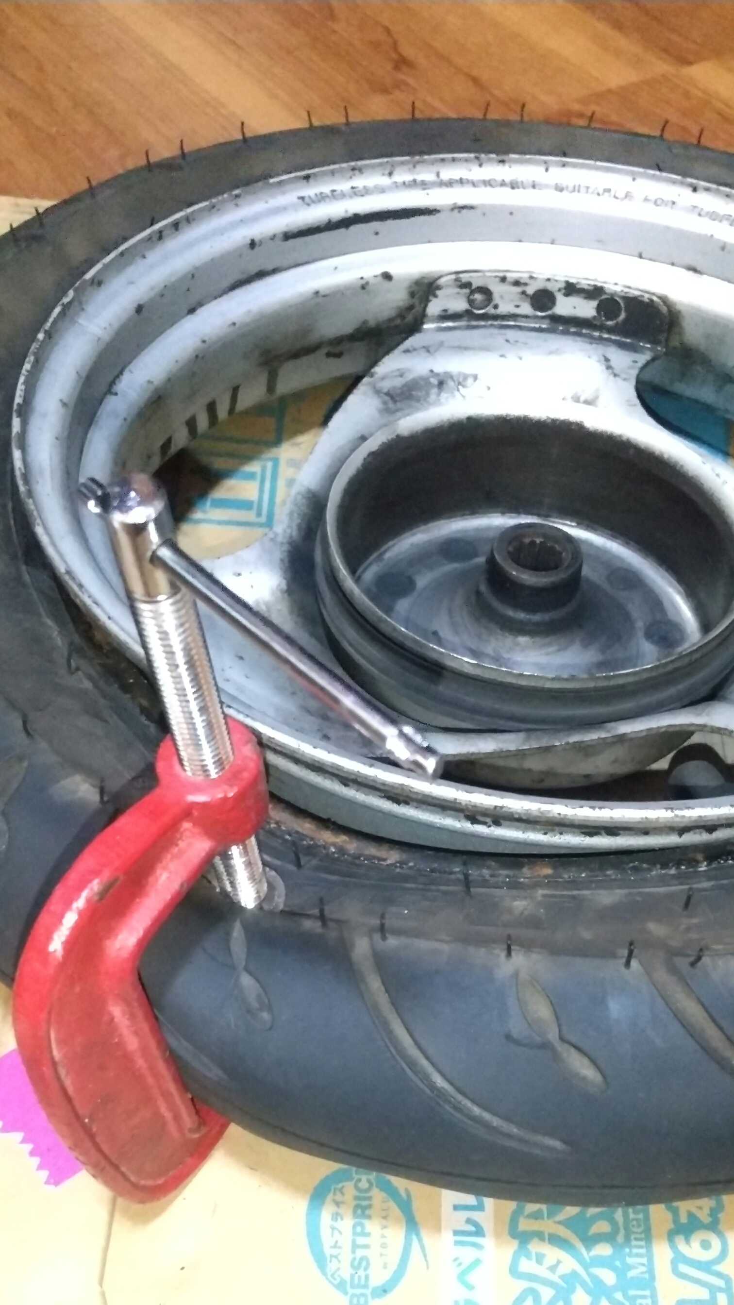 アプリオのタイヤ交換です。まず、最初はビード落としからスタート。クランプを使ってしっかり落としました。タイヤはIRCのMB90で90/90-10をチョイス。iRC(アイアールシー) MB90 90/90-10 50J TL フロント/リア 129617 バイク タイヤ スクーター・ビジネス・ミニバイクバルブも新品に交換します。L型 チューブレス タイヤ エアバルブ 6ヶ月保証付 汎用 スタンダード エアーバルブ 2個セット チューブレス バイク用 Aebs エービス ホイールバルブ 原付 バイク 修理 aiNET アイネット バイク好き ギフト あす楽対応今回、バルブインサーターも購入しました。バルブインサーター バルブ交換 エアバルブ 工具 ゴム VT-04 DIY 乗用車 TIPTOP チップトップコツは、バルブにも石鹸水塗って、じわっと力を加えて、徐々にゴムを変形させながら差し込むイメージでしたね。っで、タイヤをはめて空気入れでビードが上がらない・・・・・。まぁ、ガソリンスタンド行くか・・・・。