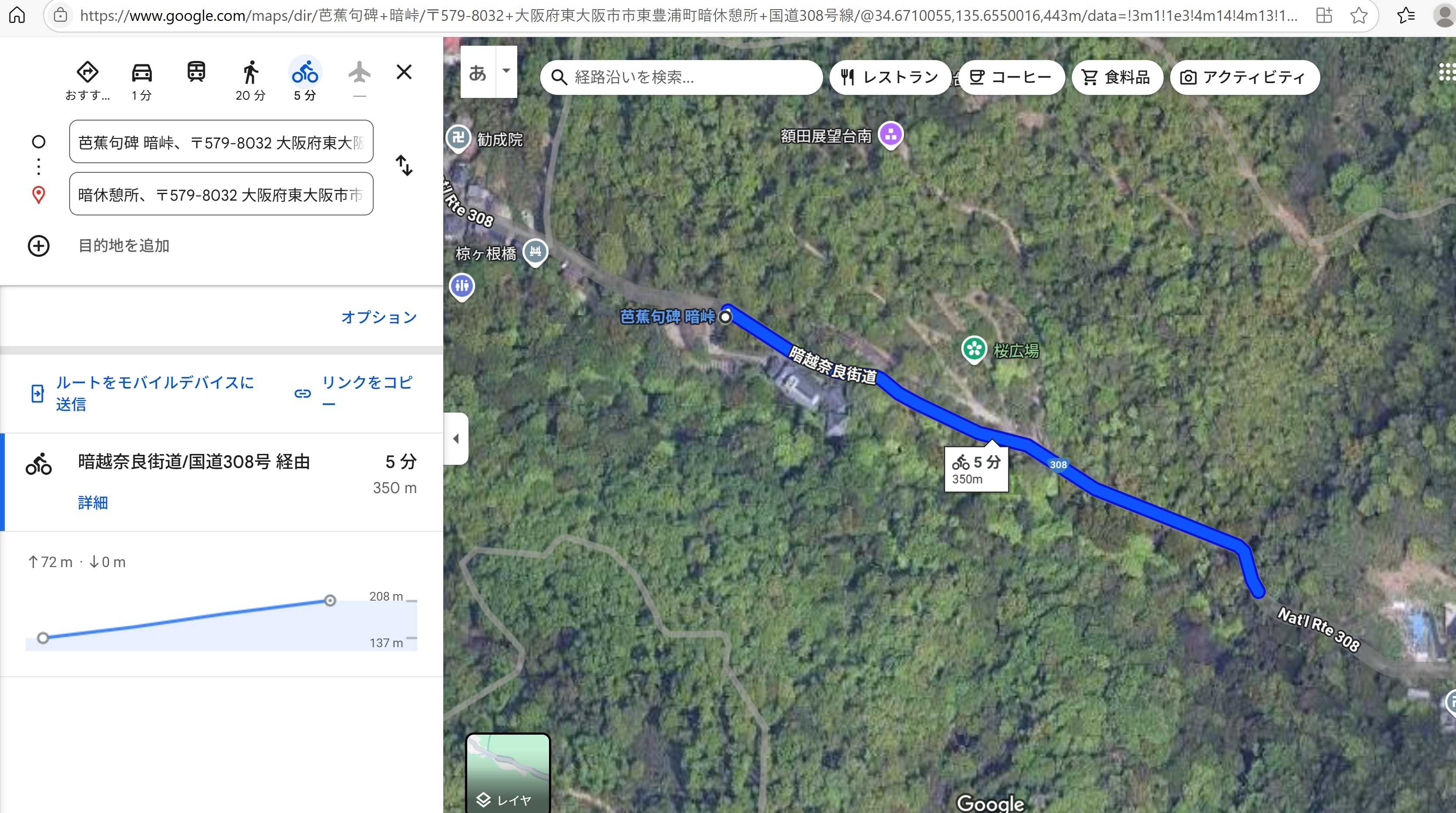 googlemapで勾配の求め方を備忘録。交通手段を自転車にすると標高差と道のりを出してくれるので、そこから算出。勾配(%)=(標高差/道のり)×100ってことで、急な坂で有名な暗がり峠の一部で調べてみた。勾配=(76m/350m)×100=21.7%確かに一度、停車すると登れない車両もあるかもしれませんね・・・・・。アプリオは7.4%でも足で勢いつけないと登れなかったし・・・・。(copilot曰く、原付が無理なく発進できるのは10%以下らしい)ちなみに、7.4%はカブなら1速で余裕で発進できますけどね・・・・。(これもcopilotにカブの最大勾配聞いたら20~22%らしい。)スーパーカブなら制覇できそうですね。