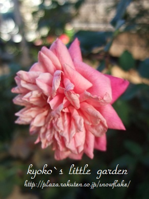 花形:カップ~ロゼット咲き/花色:紫を帯びたピンク、中心は橙色/