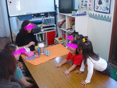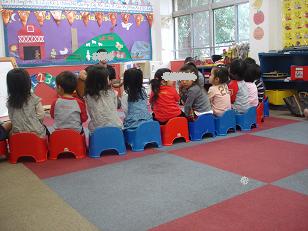 今日は幼稚園の授業参観でした前回のときはママたちが見えるとみんな、「ママ~~」と泣き出していたのですが、今回は余裕で手を振ったりしてましたちらちらママを見るShee今日は、ハンプティダンプティの絵本をよんだのですが、セリフも覚えてて、リピートしたり、なによりも、結構長いストーリーだったのですが一人も立ち上がったりしなかったことです(ふつーかな^^;)先生の言うことはみんな確実に理解してる様子。その後、グループに分かれてワークタイムですここでは、壁と、ハンプティダンプティを描きます。Sheeはまだ上手に絵がかけないのですが、それでもめちゃくちゃ褒め上手な先生が、もちろん日本人から見たらオーバーアクションで^^;褒めちぎりますこれを見て、「これは、ちょっとやそっと褒められても、うれしく感じなくなるかもなぁ」と思ってしまいましたここではひも通しをしながら数と色を教わります。 "I want blue one,please!"こんなこともみんな普通に言えるようになってましたもうひとつ、写真はないのですが、画用紙でハンプティダンプティをつくるクラフトコーナーがありました。*******************************今回の収穫は、フォニックスの歌の中で、Sheeが最近よく言ってた私の知らない英語の正体がわかったことです「ママ、ぉおぅらんがた~ん ってしってる?」と言ってたんですが、私は「は!?」って感じでした^^;orangutan オランウータン でした~ちょっとすっきり そして家では見せない一面も見れたりして、子供の成長とは、いちいちうれしいものです************************************その後は、いつもの仲良しママたちと近くにできた自然食のバイキングのレストランでランチ「ここって、私たちのためにできた」って感じです