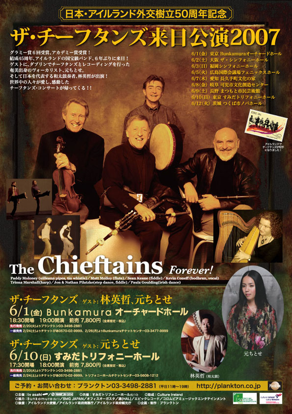 毎回思う、それが チーフタンズのライブ。。。(笑) 初めてチーフタンズを知ったときに すでにメンバーはおじいちゃん。 その時からン年経っているけど やっぱりみんな、おじいちゃん。。。(爆) そして、メンバーは 一人減り、二人減り。。。(涙) 来日するたびに、 今回が最後かも、と思いつつ毎回行ってます☆ 毎回、楽しいライブを提供してくれるチーフタンズですが 今回はゲストもたくさんで 特にわたしが気に入ったのは フィドルを弾いてアイリッシュダンスも踊る ピラツキ兄弟。(ピロシキって言いそうなんだけど) イヤ、最近のアイリッシュダンスは ブレイクダンス(死語?)みたいになっちゃったのね。。。 と思いつつ、パワフルなダンスに しかし、日本人ゲストが 元ちとせだったんだけど、 元ちとせ、英語と日本語で1曲ずつ歌ったんだけど どちらも ナニを言っているのか判らない。。。 元ちとせファンには申し訳ないけど 英語はもとより、 日本語ですら ナニを言っているのか判らないってことは ボイトレがきちんとできていないのではないかと 思うのですよ。 だって、ジーザスリザードのヘタレボーカルの歌だって このわたしの英語ヘタレ耳が聞いて、 ナニを言っているのか判るんだから。 それを日本語がナニを言っているのか 判らないってどうよ。。。? ま、イヤなことは 忘れるとして、 とにかく楽しいライブでした! 最後にはみんな、会場まで巻き込んでのダンス大会! アイリッシュトラッドというのは キッチンミュージックみたいなもので、 もともと、 自分の家で 夕飯が終わった後の団欒のときなど ギネスを飲みながら家にある楽器で演奏して 歌っていい気分で踊っていた、そういうところが ルーツなのです。 (アイリッシュトラッドをよく知らない方、 映画・タイタニックでレオさまと彼女が パーティーでダンスするシーンがあるでしょ。 あれです。) で、キッチンで演奏してると ご近所の方が 「楽しそうにやってんなあ、おい!」 といいながら、自分の楽器を持って集まってくる。 すると、どんどんプレイヤーが増えて、 ダンサーも増えて、 みんなで大賑わいでいい気分になる。。。 アイリッシュパブでよく、 演奏しているのもありますが そういう時も楽器を持っていくと 「じゃ、やってみなよ♪」 と、気軽にジョイントさせてもらえる。 歌が歌える、というと、 「じゃ、歌ってみてよ」 と、引っ張り出される。 ダンスできる、なんていおうものなら 「踊れ~!」 と、引きずり出される。。。 これが、アイリッシュトラッドのいいところです そういう、楽しいところが満載の チーフタンズのライブ、 最後には 『アナタ、どっから現れたの??』 みたいな 琵琶法師まで出てきちゃって(爆) そして終了後、 CDやパンフを買った人にはサイン会がある、 というので CD買って、 ピラツキ兄弟の列に並んで。 「エキサイティングなダンスをありがとう」 と伝えたら、 サインのところに 「12月に会おうね!」 と書いてあって。。。 苦。 やはり12月のライブにも 行かねばならぬのか。。。 うん、でも お兄ちゃん可愛かったからやっぱり行こうっと と、そんなステキな夜でした