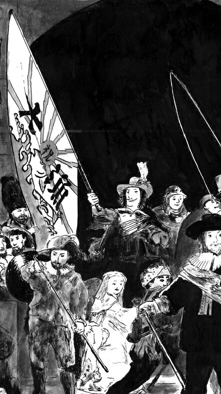 昨日までカラッ♪としとったけど、今日はジメッっとします。名古屋は休み明けから梅雨入りみたいです。釣り人にとってはどーなんすかね?俺はやらんもんでいーか悪いかわからんけど f(^_^; やらんけど、●名画の休息~夜釣「バニング・コック隊長と漁業組合の人々」(夜警「バニング・コック隊長率いる火縄銃組合の人々」) レンブラント・ファン・レイン(1606~1669年)アムステルダム国立美術館 所蔵1642年の作品門外不出とも言われてます。1606年にレンブラントは、スペインから独立直前のオランダで生まれました。父は製粉の風車小屋をライン川沿いに所有しており、★「レンブラント・ファン・レイン」 って名前は、 「ライン川の レンブラント」です。"ヴィンチ村のレオナルド"みたいっすな。14歳の時に飛び級で大学に入って両親は「法律家に!」と期待したけど、数か月でやめて画家を志しました。当時は美術学校などないので、著名な二人の歴史画家に弟子入り。3年間で絵画の基礎から解剖学まで、その後の半年間でカラヴァッジョ派の明暗を用いる技法や物語への嗜好性、表現性など多くを学びました。★その基礎が活きてるのか 「光と影の画家」「光と影の魔術師」 ってな事を言われてます。でも、油彩だけでなくエッチングや複合技法による★銅版画やデッサンも沢山残ってるし、★自画像も50点くらい描いてます。そんなレンブラントは、集団肖像画で大人気画家となりました。 集団肖像画は★オランダでは100年以上の伝統があるけど、 「記念写真か!」ってーのばっかり。 そんな中!主題を前面に押し出した『テュルプ博士の解剖学講義』で大ブレイク!!代表作かつ出世作となりました♪ そして 1642年初頭。★その後の絵画に大きな影響を与えたと言われる『夜警』を完成させました。1639年頃にバニング・コック大尉と17人の市民警護隊が、 ルイ13世にフランスから追放された「フランス王妃マリー・ド・メディチ が来るから、 警護隊会館の宴会場に飾る絵を描いてくれ!」ってゆー注文だった説があります。★報酬は1,600ギルダー。メンバー全員で割って1人当たり約100ギルダー。当時の画商の賃金が食事と住居付きで★年間123ギルダーだったそーな。 なのに!記念写真的な集団肖像画じゃなくて、「隊長と副隊長ばっかり目立っとるがや!」「何で俺らぁは こんなに後ろとか隅っこの 「その他大勢」なんだ? 金返せたーけ~!」と大揉め (>_<)。後になって門のアーチの右隅の楯に名前のリストを入れたそーだけど、 何か不自然な楯だと思ったら そーゆー事か。ビタいちもん読めんけど (;_;)「腰に鶏を吊るした 得たいの知れん少女」も描かれてますが、鶏の爪が火縄銃組合の象徴だからだという説が有力です。そんな感じで発注者からすりゃ滅茶苦茶だけど、準備をする警護隊をドラマチックに描いた歴史に残る傑作です♪ 隊長と副隊長が打ち合わせする周りで、 続々と集まってきて 槍とか火縄銃とか持って 準備をする隊員達 っ っ っと思ったら ギョギョッ! 警護じゃなくて「釣り」の準備!? 痛ぇててて、ここで振り回すなって! イタズラに使うなよーっ。 おい、何で和太鼓を持ってきた? 猫の狙いは白蛇だったのか...? 魚拓だけに、うお~?! 今日も大漁でありますよーに★ 「釣り」もいーけど「スリ」にも気を付けて!「夜釣(バニング・コック隊長と漁業組合の人々)」 2024年 210×296mmhttps://www.sodfactory.com/shopNF.htmlっってな訳で、レンブラントの傑作「夜警」ですが、「ニスの劣化」のせーで暗くなって夜に見えるだけで★本当は「昼警」でした!18世紀か19世紀頃から「夜警」って言われだしたけど、★今でも正確なタイトルは定まってないそーな。『フランス・バニング・コック隊長とウィレム・ファン・ラウテンブルフ副隊長の市民隊』とか『バニング・コック隊長率いる火縄銃組合の人々』とかまー要するに、"コック隊長とその仲間達の集団肖像画"です。タイトルは決まってないけど当時は、 「コック隊長が目立っちゃっとる絵」って言えば通じたはずです(俺の想像)。参考文献 : イロハアート「はなさん」の記事 :Wikipedia★夜釣グッズもあるよ♪https://www.sodfactory.com/goods.html●「夜釣」製作過程https://www.sodfactory.com/moulinmotion.html●他の「名画の休息」を読むhttps://www.sodfactory.com/meiQ.html●SOD factory売店https://www.sodfactory.com/kaimonokago.html#夜釣り #釣り #モノクロ #SODfactory #美楽 #美術 #芸術 #アートグッズ #飾る #レンブラント #夜警 #ニス #お祝い #プレゼント #絵画 #名画 #アート #購入 #名画の休息 #模様替え #インテリア