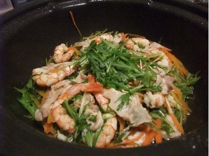お久しぶりです。今日のご飯はお鍋です。ぶたしゃぶ。エビも入って、野菜たっぷり冬は鍋でしょ!