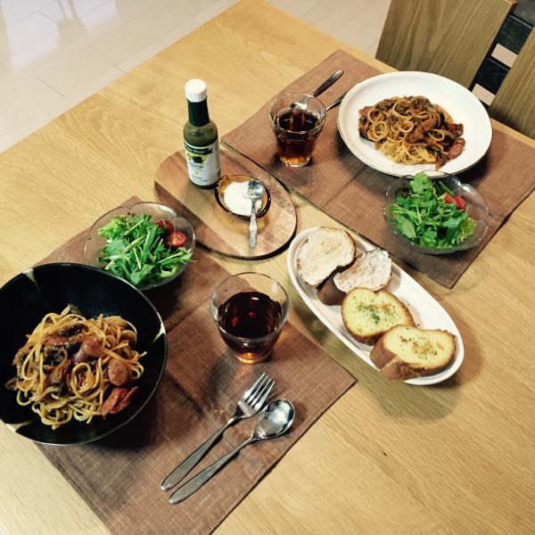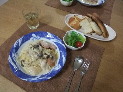 久しぶりの更新今日のご飯クリームスパゲティおいしかったです。パンも手作りパンスープに浸して食べるととっても満足