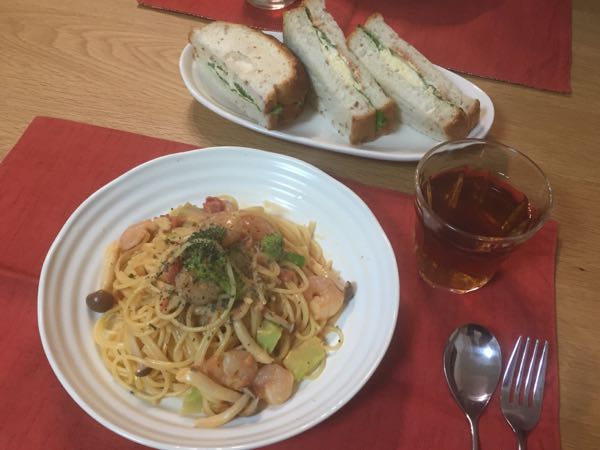 今日のご飯はエビとトマトのクリームスパゲティーとライ麦のミックスサンド