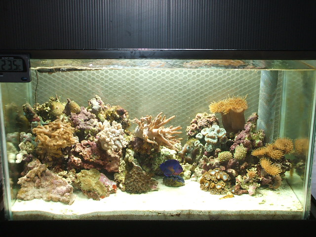 いままでテスト期間だったので、随分ブログを怠ってしまいました・・・でもまた今日からしっかりやります!!最近は特に変わったことはありませんでした。水換えをして、順調にどの水槽も回っているようです。2日前にレイアウトを少し変更しました。 移動直後でサンゴの開きが悪いのはご了承ください。で、レイアウトを変更した結果、少し入れるのが難しくなってしまったサンゴを40cm水槽のほうに移し変えました。 テキトーに置いただけです・・・。そして、今日は重い腰を上げて、今までさんざんサボってきた水槽周りの片づけをやりました。どうもこの趣味はポンプやら機材やらが溜まっていってしまいますね・・・。なのでDIYに使った塩ビ版のはぎれや、使わないと思われるポンプ、ファンなどを捨てたり戸棚にしまったりしました。おかげで随分と綺麗になりました。先日剪定を行ったウミキノコ。ルリヤッコが邪魔ですね・・・。このルリヤッコもずいぶんとたくましくなりました。。。 なかなか開いてくれません・・・。余談ですが、今、水槽台の製作を予定しています。(あくまでも予定ですが・・・。)45cm水槽を置けるくらいのサイズを検討していて、昨日、三丁目の夕日を見ながら構想を練りました。2×4の木材で行こうと思っています。難しいのかなぁ。