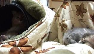 とっても子煩悩でいい子ちゃんのちわ君です。よく見ると左側にあるキャリーの中にちわ君がいて一緒にきん君が寝ています。仔猫たちが寒いといけないと思い、家族のものがコタツカバーをキャリーに被せておいてくれました。そのカバーのちょうど膝の上にあたる画面左で寝ているのは銀君です。でも、もっとよく見てみると…分かり辛い写真ですが、ちわ君何故か流し目なのよねェ…※仔猫たちの写真は下の日記です☆