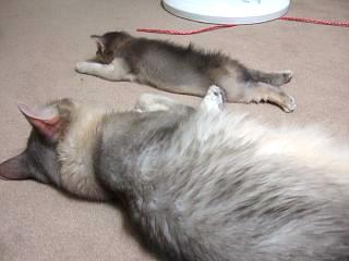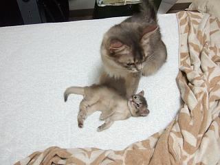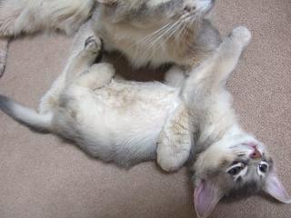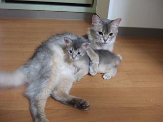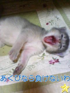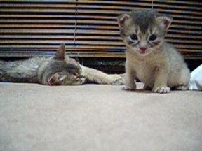 (* ̄∇ ̄)あはっちょっぴり更新サボっちゃったティオ君が、生後1ヶ月になったので日中は生徒さんが遊びに来てくれたり仕事に行ったり、家事したりアイドル画像を漁ってみたりケロロ軍曹DVDを一機見してみたり忙しくて~( ・◇・)?(・◇・ )そんな訳で、ブログからちょっと遠ざかっていました。しかし、その間にもスクスクと我が家の神童は成長しているわけで…アニモンダが好物なので粉の離乳食なんか食ってられませ~ん♪って、アピールしてみたり食べるものを食べるようになれば出すものも出すようになり22日夜には、初トイレを経験。(廊下にブツが転がっていました…)一人っ子で寂しいだろうと危惧していたらいつの間にかお友達を作って添いネンネしてみたり(ジ~ン)それでもちゃんとママと遊んであげたり(?)そんなことをしていました。って、もう仕事の時間じゃ~ん。ふぉ~~~さくっと有美子んちへ行って来るであります!!