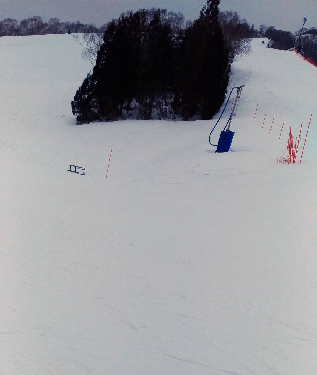 同じくγリフト終点からダウンヒルコースの眺め、ダウンヒルコースはテレインパークの中間部との接続から下は斜度がアップします。