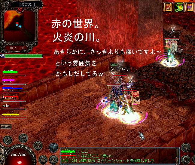 天空探検隊の記録も其ノ四まで参りました。さて。火炎の川に着いた探検隊一行。さっきまでの乾いた感じとは一変。どろどろと溶岩が流れるさまは、壮観ですね。熱そうーーー(´ヘ`;)秋冬にはぴったり 溶けそうな紅の川。自らも溶岩の一部になってしまいそうです・ ・ ・装備の足って耐火・耐熱製にすぐれてるのねぇぇ。Lv80以上の世界だから・ ・ ・セイクリッド以上ならOKってことなのでしょうか。溶岩系といえば、マルスにもあったかしら。はじめて会うモンスターばかりで、どれが危険際まりないのか判断できません(>_<;)エリートモンスターには気をつけましょう・ ・ ・なかには、ベヒーモスなどファン城モンスターも現れましたね。スタンをかけてくるモンスターには、魔盾が有効なようです。マジシャンの役割があるって良いですね^^今回はダブルマジだったので、ターゲット分散にも一役買えたのじゃないかなぁ。普段、1パーティー6人のなかにマジシャンが2人ってあまりないと思う。ゆらたんと一緒することがあっても、それは図書館で、何パーティーにてあがっていくときが主だったものね。もちろん別パーティーになっちゃうし。今回一緒できて本当に嬉しかったです。また一緒に行こうね^^紅い世界に別れをつげて・ ・ ・さぁ つぎの世界へ((=゚Д゚=)ノ ドコデモドア-冂作戦:いのち だいじに を胸に 我らが天空探検隊は訓練の川を渡るのであった・・・つづく。
