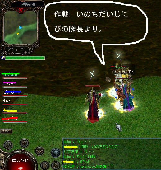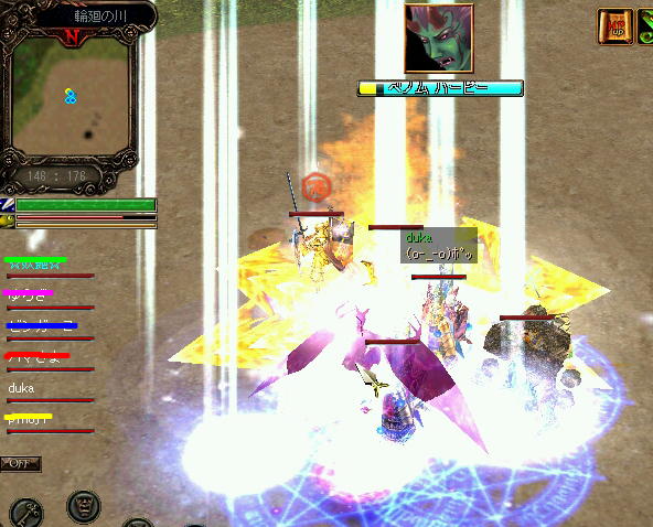 さてさて。見事ぴのさん逆ナン(えw)成功したでゅーは、 天空探検隊を結成ヽ(´ー`)ノぴのさんを先頭に、島を探索することと相成った。みんなでターゲットを取り合いながら、移動したため、思ったよりも死亡率は低かった。皆、一様に思い思いの課金スクロールをめいっぱい乗せてるのだろう。さすが試験世界。ゴージャスですわね(*´д`*)まずは船着場から程近い輪廻の川をめぐってみる。ぴの隊長の先導のもと、我らが天空探検隊は道なき道を進んでゆく・・・ むむ これは( ゚д゚)ハッ! 水・ ・ ・ ・!!!(;ωノ|柱|ねぇ おぼれない?歩いてるそばから誰か浮いちゃわない?これ重要。日ごろ色んなところで落下・水没を経験しているでゅーにとって水辺は危険以外のなにものでもない(ノ ゚Д゚)ノ ==== ┻━━┻・ ・ ・と不安に思っているのはあたしだけのようね(´ヘ`;)みんな きれぇぇいヽ(´▽`)ノヽ(´▽`)ノと はしゃいでらっしゃいます でゅーはというと・・・・ o(・_・= ・_・)o キョロキョロ 安全確認あんぜんかくにん。誰も沈んでこないのを 目視してから(ヒドイ恐る恐る後ろについて歩いていくのでした。 まぁ よく見ると、足つくし、浅瀬だし、まったくもって危険がないわけで。 つい。。。。(*´∀`)(´∀`*)ネー おぉ・・・ っと 早速水辺にて 初モンスター登場。ゆきちゃんの言うとおり、良くない気運を感じちゃいます。まだ ここは きれぇぇい(*´д`*) と言う余裕がある場所のようです隊長~。さて、水あそびから上陸した探検隊。上陸したところで いまさら きれい^^ と発言。出遅れ感満点なのは 重々承知です|ω・`)ジー これこれ。グリフォン。みなさまお気をつけください。どんなのか すーーっかり忘れちゃいましたが・・・なんだかやっかいなモンスターだった・・・とだけ頭に残っています。さて。輪廻の川の最果てに 石碑があり、読んでみることにしました。座標は 75:293 あたり。 うーむ・・・ いま そう いまこの石碑をちゃんと読んだのですけれど・・・ 門番がいるみたいです(@・´д・)(・д`・@)ネー なにをいまさら ・ ・ ・!! なこの反応。 一番うしろにちょこちょことついていたのもので・・・隊長率いる先発隊の方が門番を えいやっとやっつけていて下さっていたなんていま 初めて気づきました(/ω\)ハズカシーィ|д゚*)あらためて みなさまアリガトウ~。さて。気を取り直して探検たんけん♪無事門番を倒し、川の向こうに渡った天空探検隊。待ち受けるのは・・・・・・乞うご期待。次号:火の世界。火炎の川よりお送りします|д゚*)ノつづく。