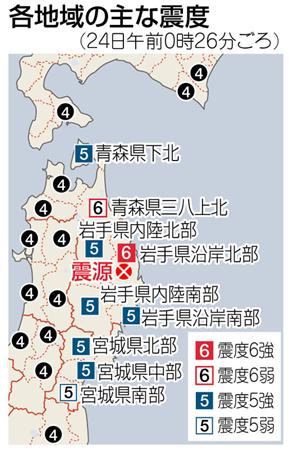 7月24日、12時26分頃、東北地方で大きな地震がありました。震源は、岩手県沿岸北部、震源地と青森県三八上北は、震度6の強震です。 岩手県全域と青森県沿岸部は震度5となっています。秋田は、震度4程度でしたからたいしたことは無いようです。岩手県は、前回の岩手・宮城内陸地震の傷跡も癒えない内の大きい地震ですので、とても心配です。被害が無いことを、心からお祈りしています。http://headlines.yahoo.co.jp/hl?a=20080724-00000900-san-soci