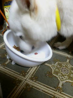 最近、ちょっとシロがドッグフードを食べにくそうです。確かに今年で16歳なので、奥歯や犬歯に歯石が付いていてかなり食べにくそう。。。(~_~;)歯石取りを獣医さんに頼むとしてもらえるんだけど、うちのシロはその前に麻酔の方がちょっと心配なんです。(ヘタするとショック死ということもあるみたい)こればっかりは獣医さんが素晴らしい方でも ちょっと心配なので高齢だし、あきらめないと…そこで、今日は半生タイプのドッグフードを買ってきたんだけど、あまり喜んで食べませんでした。シロ用に買ってきたフードなのに……餌入れのお皿に半生フードを入れてたら…たろうが発見!ガツガツ食べた(あちゃー)次に、そらが発見!これまた、まっしぐらに食べた(またまた あちゃー)あまりの喰いっぷりに、怒れませんでした(笑) ←食べた犯人。久々のおっさん顔(笑)こりゃっ、そらとたろうが食べてど~すんの!もしかすると、また別なフードを買わなければいけないかも??シロの満足するえさは 何だろうか?高齢犬用で、ダイエットにもよくて、関節をサポートするのが入っていて目や免疫力もアップして、お値段もお手頃で、安全で、半生で…と私の注文が多すぎるのだろうか??(笑)(本当はもっと希望することはある)皆さんは愛犬、猫ちゃんのえさの内容成分ってこだわりませんか??ま、明日は久しぶりに友達とランチに行く予定なのでそれから考えるとします。私は歯は大丈夫ですっ!(笑)銀歯が光ってるぞ