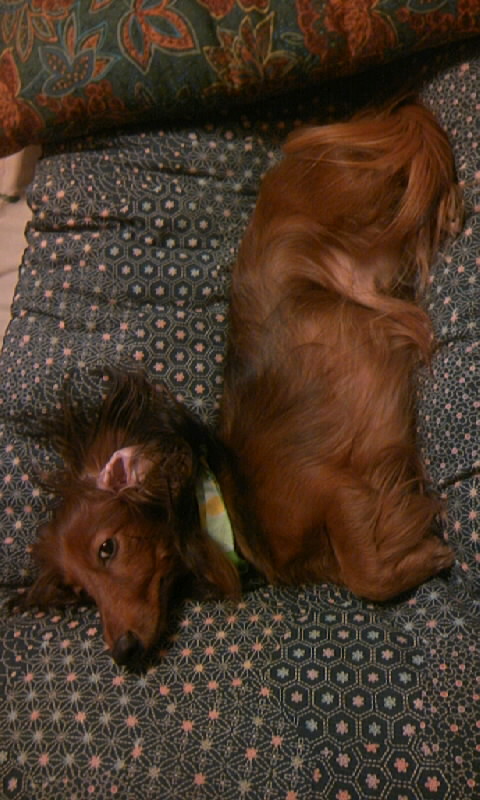 週末は仕事も休みということで夜更かしをしてテレビを見ていました。いつもは寝る時間ですが、明かりがついているし、ご主人は起きているのでもいつもと違ってなかなか寝れませんでした。さすがにそらchanも限界がきたようで、自分で寝床を作って「バタっ」と横たわって眠り始めました。でもやっぱり物音がするのでなかなか眠れず、また起き上がったりしていました。そらchanの習性でおもちゃを咥えて「注入」をするのですが、それも眠りながらやっていました。「うとうとと」。頭が横にくらっとなりながら。(写真が無いのが残念!)もうその後は爆睡!もう死んでしまったかのように寝てました。でもたまに夢を見ているのでしょうか?「ワン。ワン」と寝たままほえていました。草原でも走っている夢でも見ているのかなぁ?そんなそらchanでした!