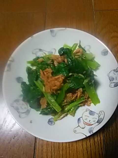 栄養指導の課題。新年最初。「ツナ缶詰」の本からの一品です。小松菜ツナ缶生姜すりおろし(チューブ)醤油(減塩)砂糖材料はこれだけ。食べてみたけど、お砂糖入れなくてもええかなぁ。。。😅