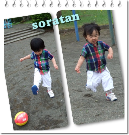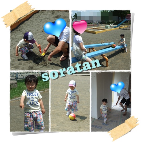 1歳11か月と26日目今日もお天気良くて、、、暑いーーーーーーーーーーーーこんな日は、、園庭解放だぁーーーー明日、、引っ越しなのに、、育児は続く。。。。。。今日は、、園児達が、、砂場で遊んでて、、soratanも混ぜてもらって、、遊んでたぁ自分で飛びついて行ったのに、、スコップ持って「ママ。。。」って、、遊んでいい?みたいな確認してた。。。「いいよ。。」って言った瞬間、、土掛けまくり~でも、、先生ってホント遊び方上手ーー。。って思っちゃったぁ。。褒め方とか、、その子その子に役割作ってあげて、、みんなで山作ったり、、トンネル掘ったりやっぱり、、ママとより、、みんなと遊ぶ方が楽しそうちゃんと先生の言う事聞いてるし。。。こういうの見ると、、保育園とかに入れた方が楽しいのかなぁって思っちゃうのよねちょっと寂しい。。。。。ケケケ園児達はとっても活発で、、同じ年齢くらいなのに、、随分違うなぁって思っちゃったぁ。。そして、、外にある滑り台に、初めて自分で滑るって言いだし、、上らせると。。「こわいーーーーーーーーーー」アチャ。。みんな、、ガンガン滑ってるのに。。やっぱりビビリちゃんねぇ。。ママが手をつなぐと、、喜んで何回も滑ってた今日は、、大満足だったのか、、とっても素直ちゃんで、、しかも優しいママが咳き込んでたら、、大丈夫?と言って、、背中さすって、、自分のマグ持って来てくれたイライラしちゃう事も多いし、、育児に不安も多いけど、、こういう事されると、、ちょっと自信つくし嬉しくて。。。涙。。。。早く引っ越しも落ち着いて、、、たくさん遊んであげよーーーっとネットの回線でいろいろあるようで、、しばらく更新も出来そうにありませんが、、soratanの誕生日もあるので、、何とか、、頑張って更新したいですまた遊びに来てもらえたら嬉しいです落ち着いたら、、みなさんの所にもおじゃましまーす